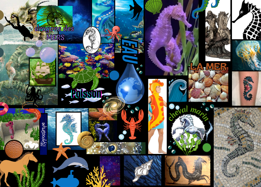 J’ai fais un moodboard qui devait correspondre à l’animal choisit, dans mon cas l’hippocampe, reflétant son univers graphique et ce qu’il rprésente..
